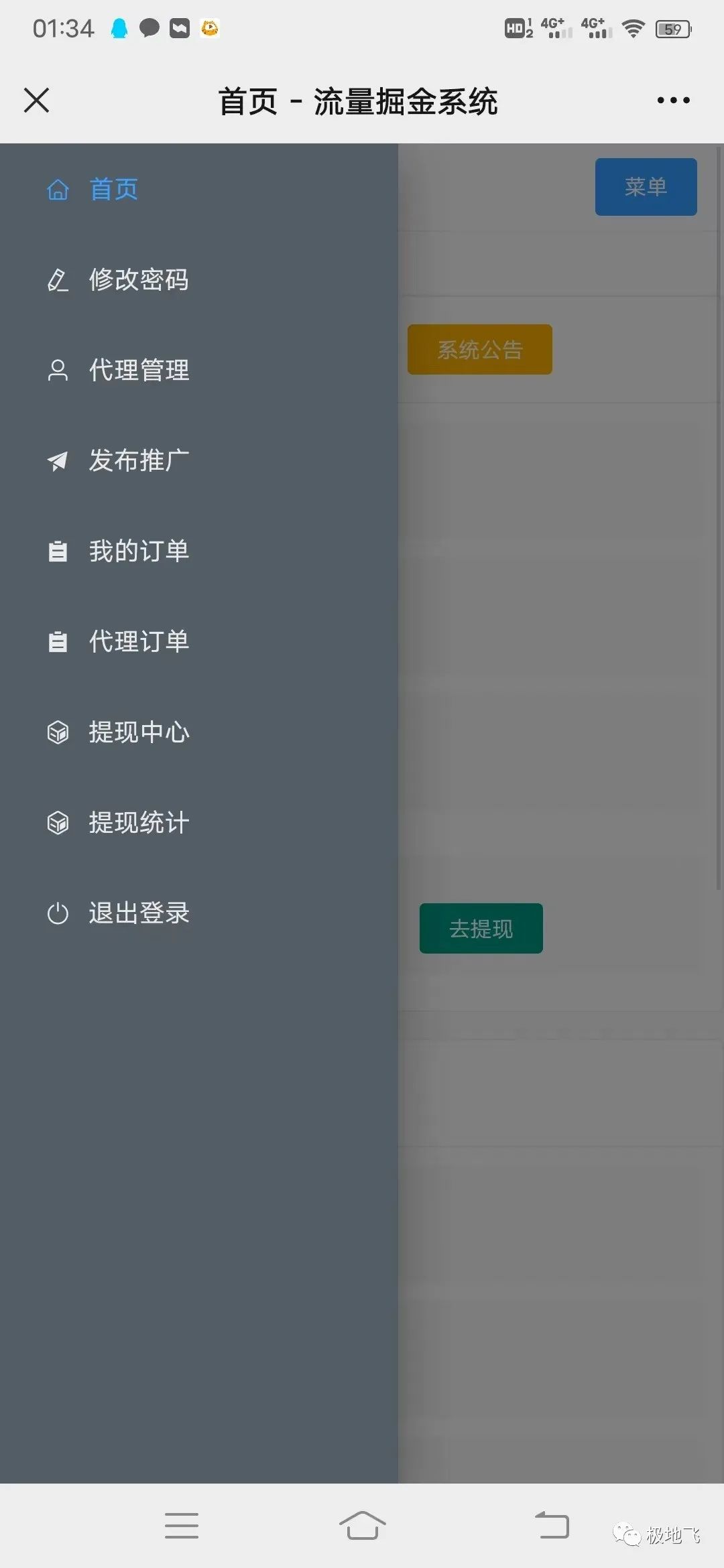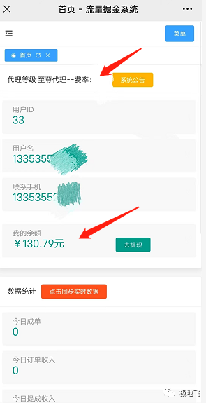 首页非常简洁:代理等级,上级费率,余额,订单收入,提成收入。