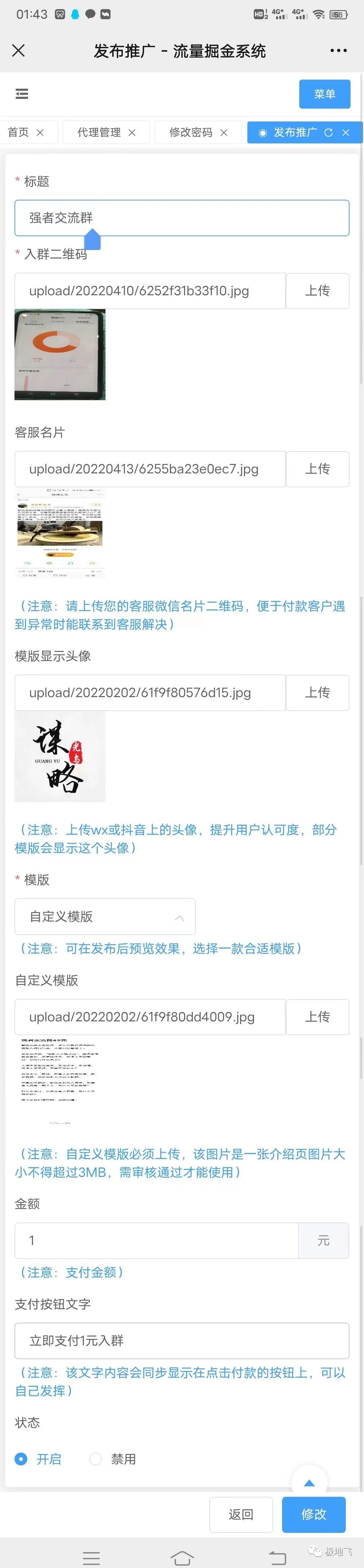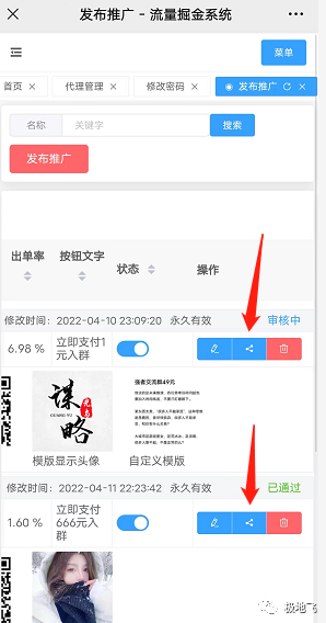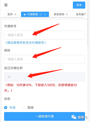 点开代理管理界面,代理账号里面输入下级手机号,密码随意填一个。然后点一键新增就ok,这时候代理的账号,就能登陆后台了。(分佣比例可以联系上级,根据实际需求随意更改)
