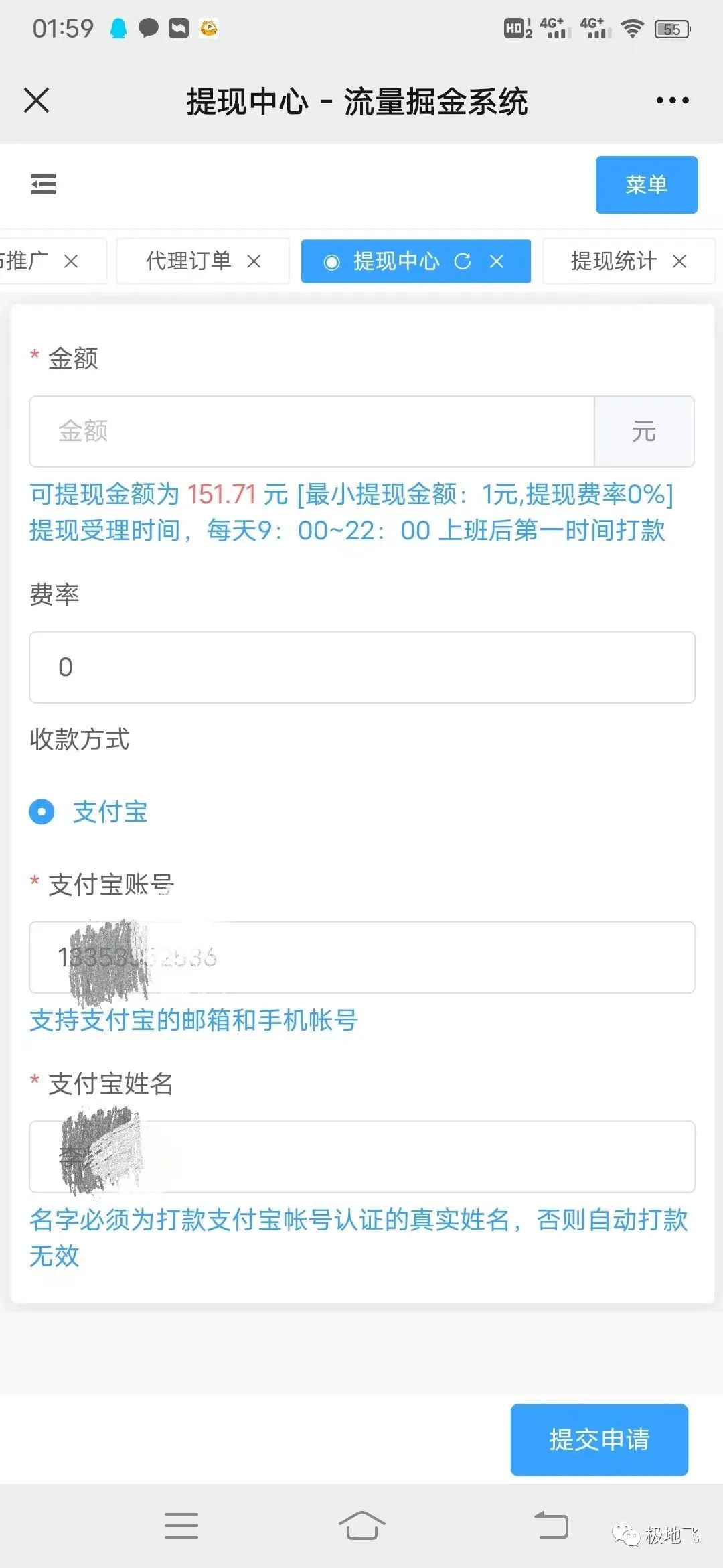 提现中心:输入金额和正确的手机号和名字。(企业支付宝自动打款,秒到账)