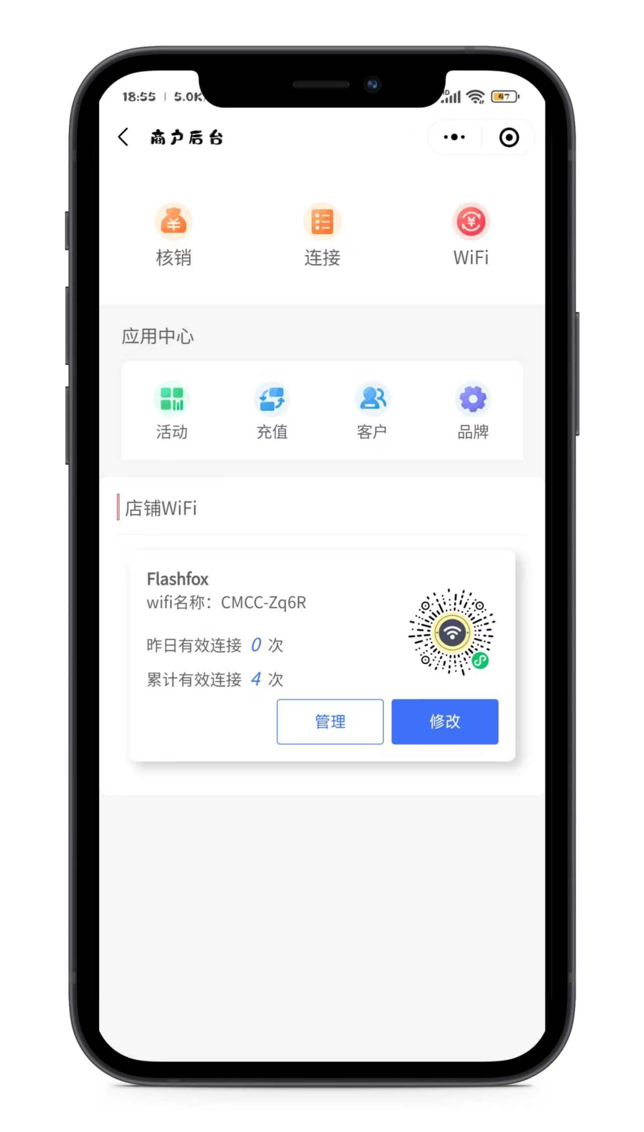 小闪WiFi专业版比较注重落地运营,也就是说你的客户就是终端客户,你所要做的就是地推,邀请商家入驻,给商家开通Wi-Fi码(更换店里的Wi-Fi),根据商家店里的餐桌数量给商家对应的Wi-Fi码粘贴上去。作为系统运营者来说这些事情你应该分配给拓展员去完成,分钱就完事了。 你的收益来源有哪些? (1)卖系统 我们开发的这套系统是Saas架构的,也就是说你只要部署了这套系统,可以无限开通子账户,每个子账户对应一个系统,数据是完全独立的,也就是说一个子账户对应一个小程序,想和你一样运营的人可以考虑卖系统给他。 (2)招团长 如果你是自己运营,那你可以设置招代理的费用是,比如想成为团长需要交费才能有对应的权限,目前我所了解到的市面上的招商费用高达60000元的代理费用,最低的也是几千乃至几万的,所以招募团长是你发展的最好方式。 (3)招拓展员拓展员其实不用你操心,你设计好运营模式之后,团长会去找拓展员推广,这样覆盖就会很快了。 运行环境 PHP+MYSQL+APACHE/NGINX< 安装说明 安装源码到根目录 1、网站运行目录public 2、PHP7.2,开通SSL 3、导入数据库文件 4、修改数据库文件里application/database.php的数据库信息 5、登入用户名:admin密码:123456 前端教程 1:微信开发者工具打开前端源码,选择你对应的小程序appid 2:修改目录下siteinfo.js文件 name: “你的wifi小程序名称”, siteroot: “https://你自己的域名/index.php?s=/api”, uniacid: “10001”//平台ID(在后台看) 3:开发前在后台配置好你自己的小程序appid根密匙