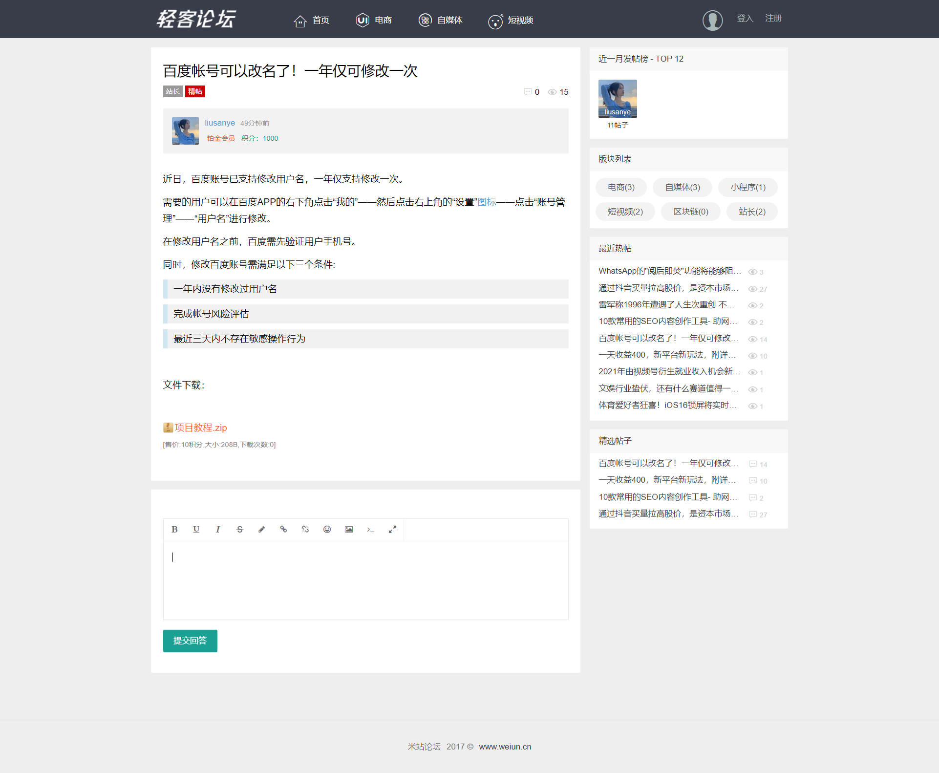 极简轻论坛采用Thinkphp5.0+mysql开发的一款小型论坛系统,支持积分功能、捐赠二维码、付费附件、会员等级、发帖编辑、横屏模式、帖子置顶/精帖,后台支持备份/恢复数据库等功能。适合企业内部交流、小型讨论型社区论坛。代码包小巧,搭建简单、上手快!