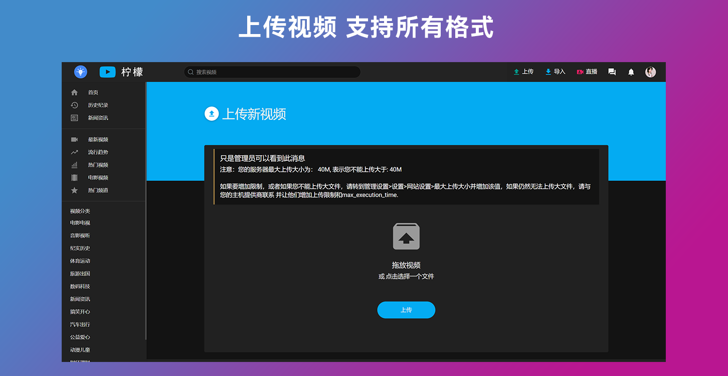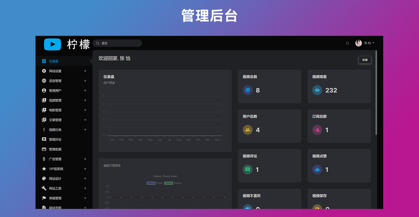 这是一款视频网站源代码,程序语言是PHP,你可以利用这款源代码快速搭建自己的视频网站,搭建完成以后用户可以在你的网站上面注册上传视频评论视频和分享视频等,与此同时这款系统它支持ffmpeg,这意味着你可以上传任何格式的视频并转换成不同分辨率的视频,并且上传视频自动获取封面图,系统配备了三款主题风格,你可以根据你喜欢的模板在后台自由切换你喜欢的主题,配合后台管理,你可以设置网站名称和网站的图标logo等等。如果你搭建视频网站我们强烈推荐这款。
