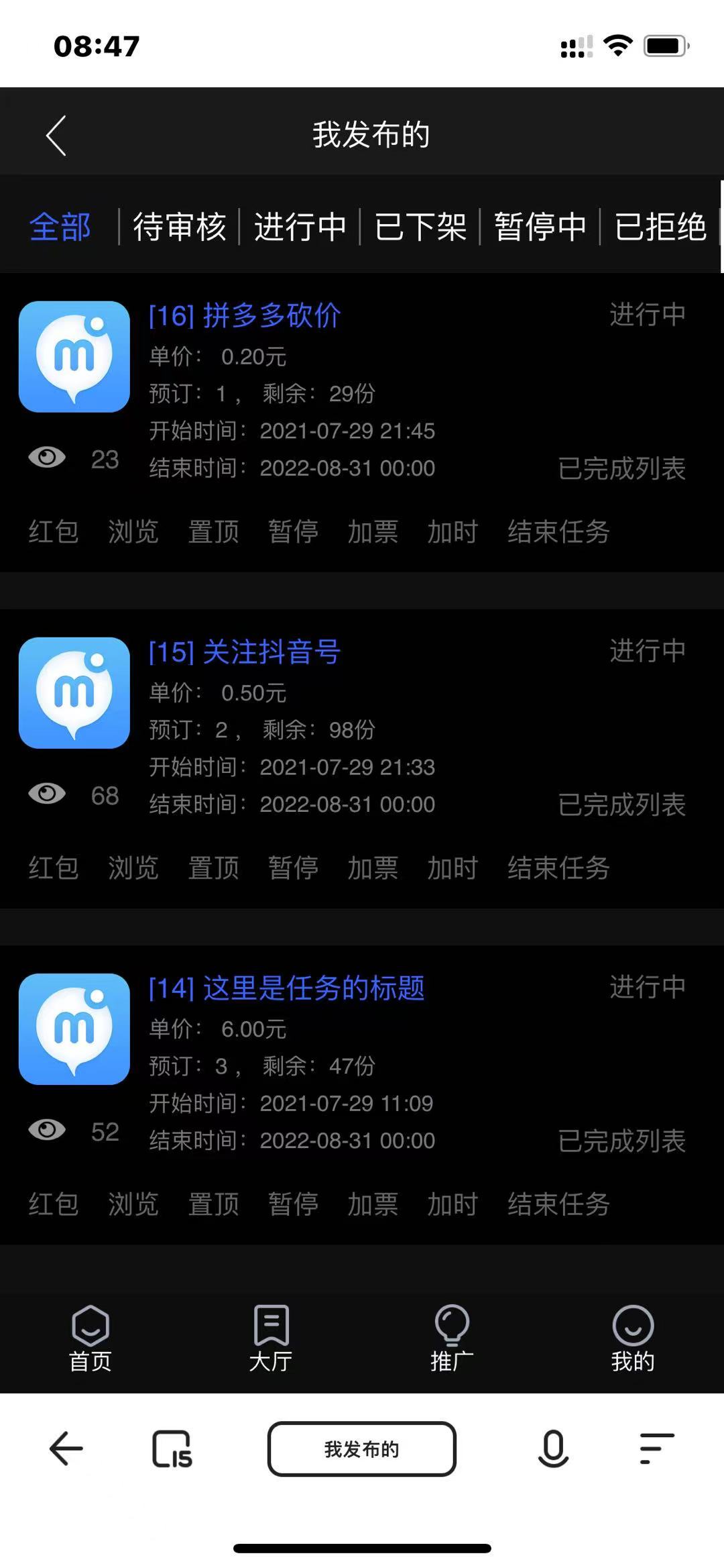 支持用户发布任务、置顶任务、发布任务红包、浏览任务、下架任务、分享任务、管理任务、暂停任务、任务加量、结束任务等