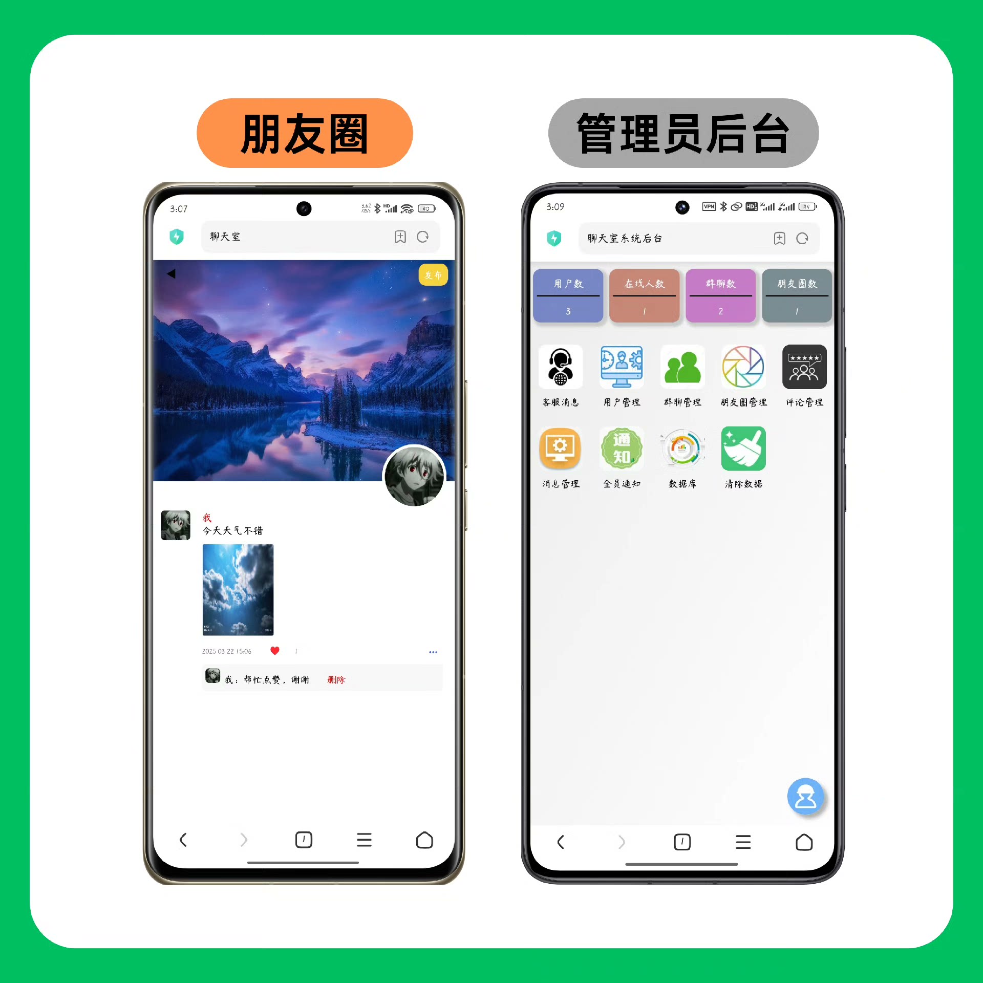 用户管理✔群发通知✔朋友圈功能✔