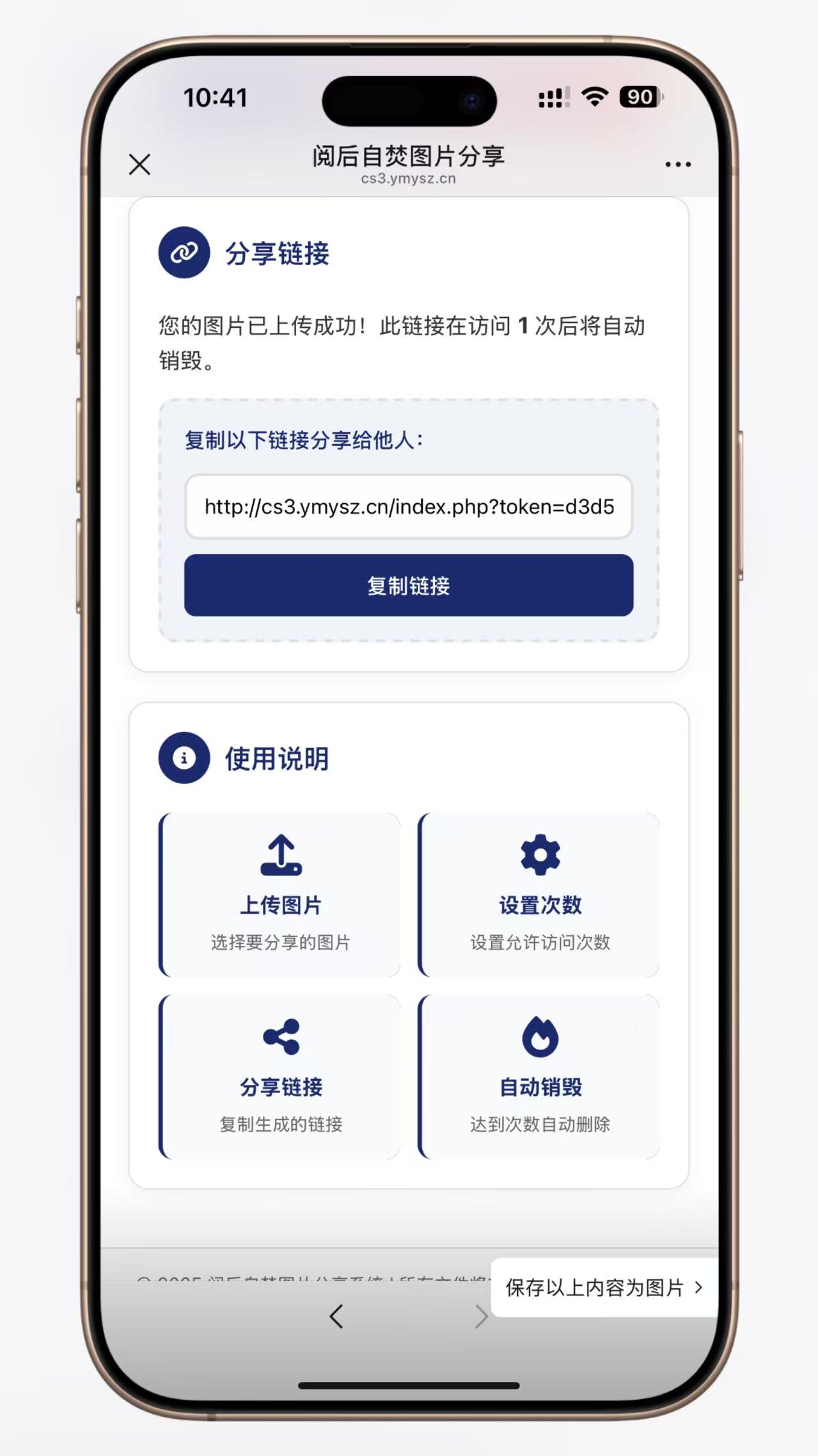 后续所有访问该链接的用户将无法再看到图片(可自定义提示信息,如“图片已销毁”)。