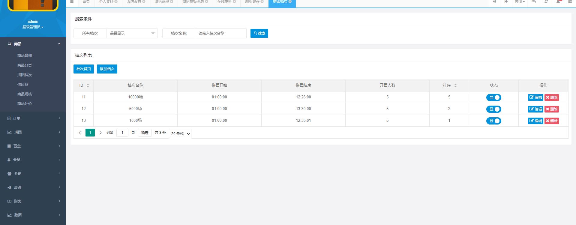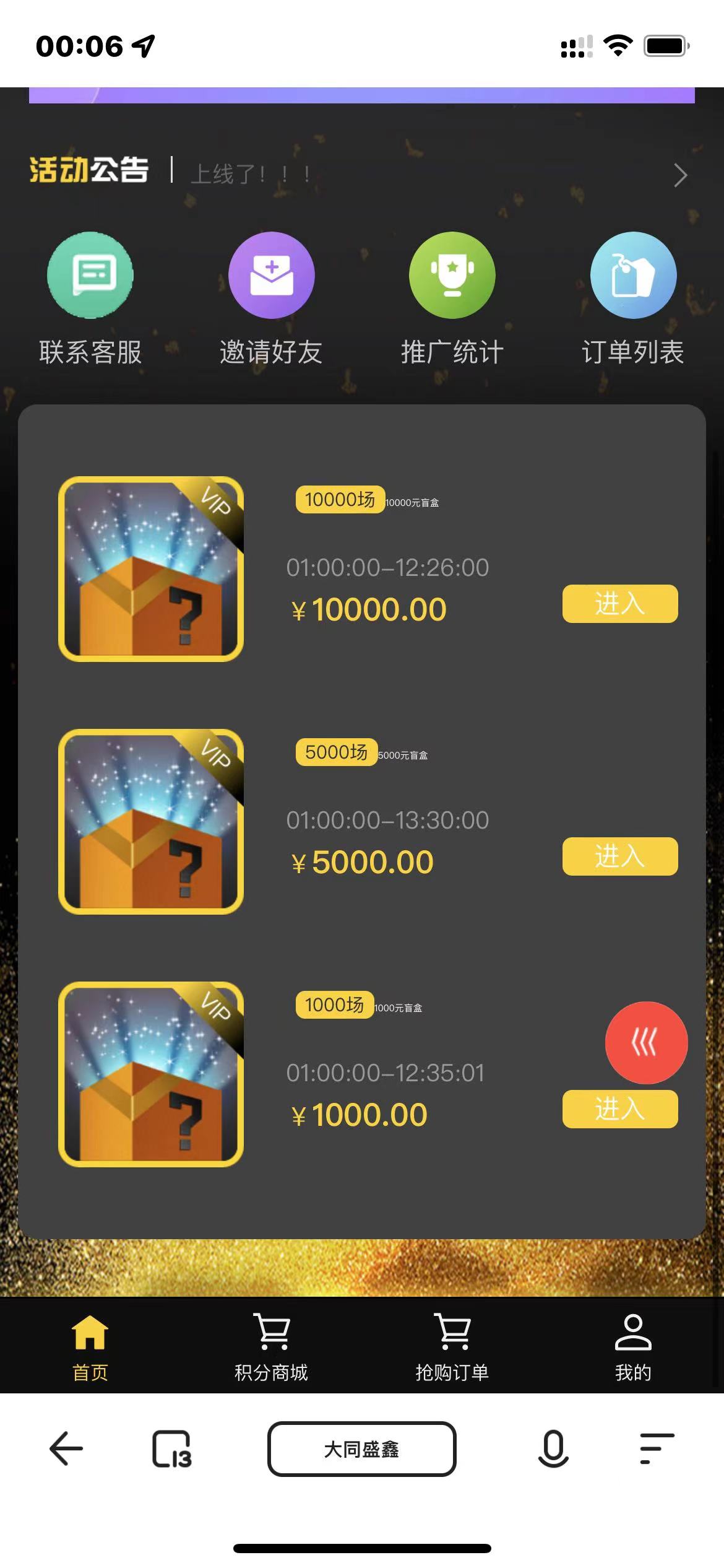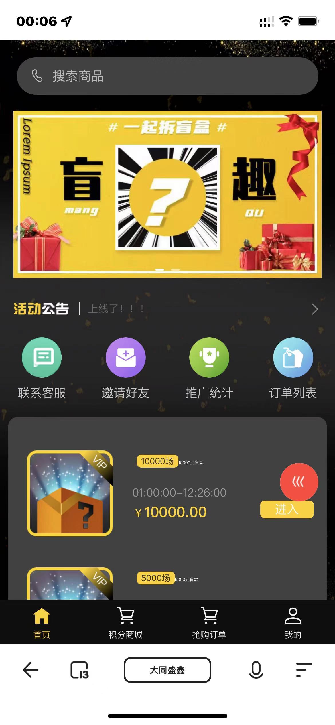 H5拼团抽奖盲盒源码,抽奖拼团玩法,三个房间,每个房间的价格不一样,比如1000的房间,里面的商品价格是1000以内的,用户购买之后等待开奖,然后平台随机发货,盲盒模式